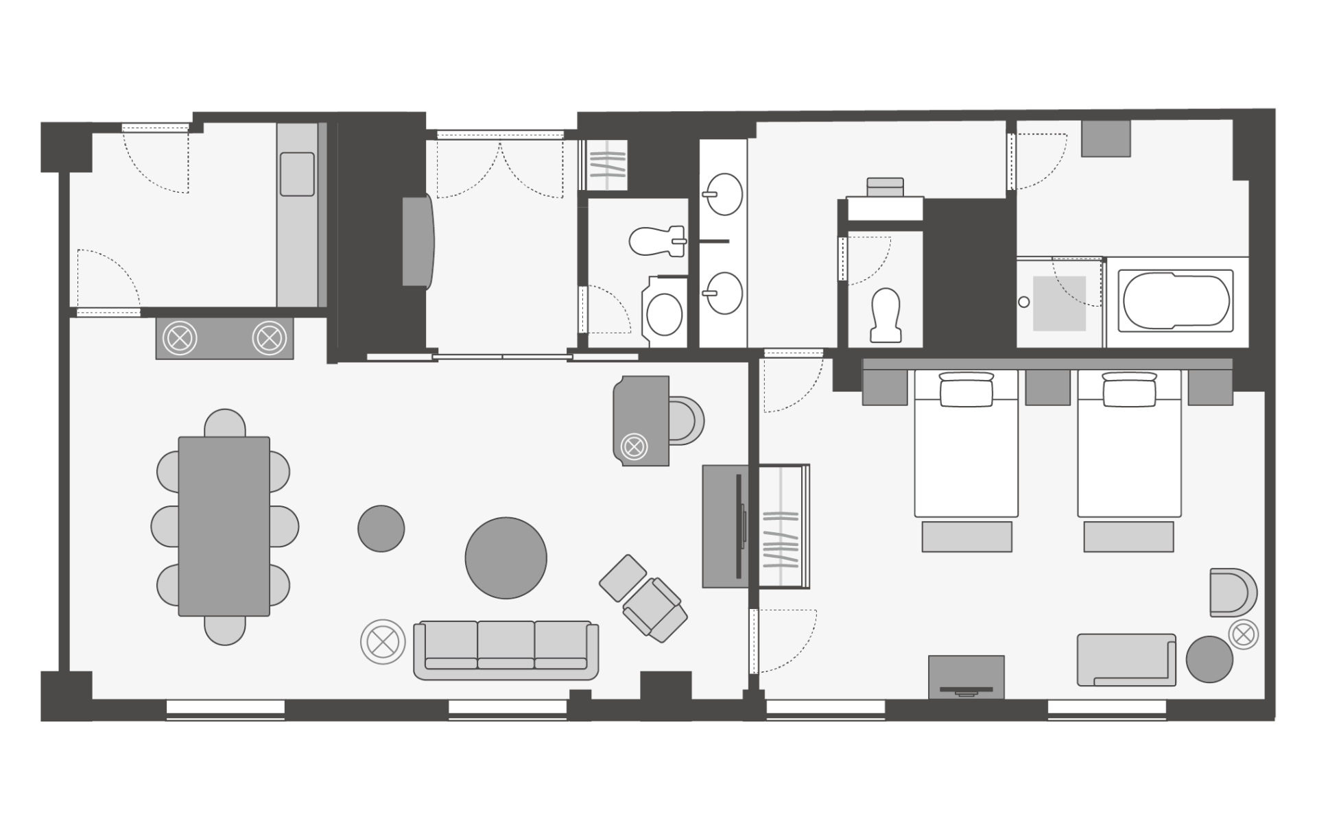 57㎡の広々とした客室で、リビングルームに続くようにベッドルームが配され、